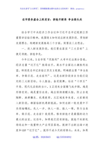 / 在市委务虚会上的发言:拼抢开新局 争当排头兵
