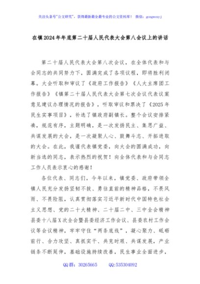 / 在镇2024年年底第二十届人民代表大会第八会议上的讲话