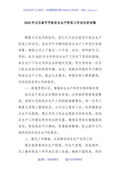 2025年元旦春节节前安全生产防范工作会议讲话稿