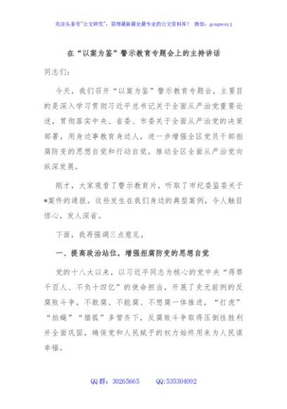 / 在“以案为鉴”警示教育专题会上的主持讲话