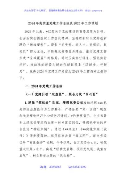 / 2024年高质量党建工作总结及2025年工作谋划