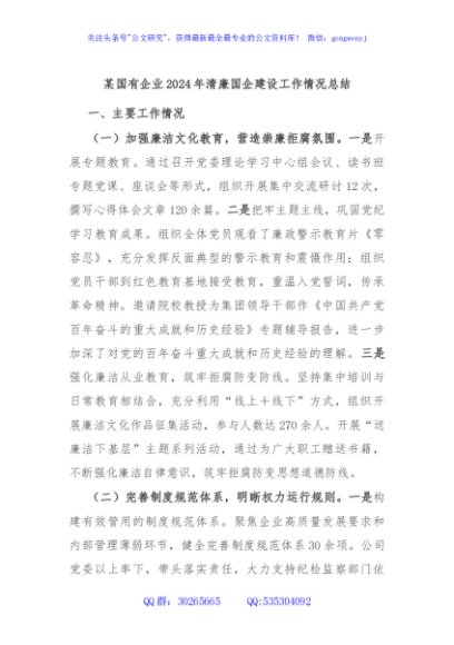/ 某国有企业2024年清廉国企建设工作情况总结