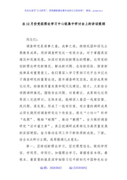 / 在12月份党组理论学习中心组集中研讨会上的讲话提纲