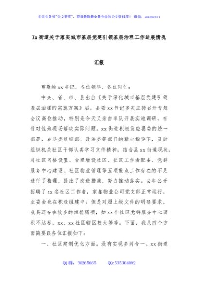 / Xx街道关于落实城市基层党建引领基层治理工作进展情况汇报