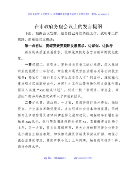 / 在市政府务虚会议上的发言提纲