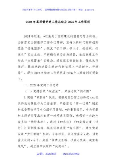 / 2024年高质量党建工作总结及2025年工作谋划