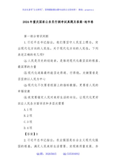 / 2024年重庆国家公务员行测考试真题及答案-地市卷