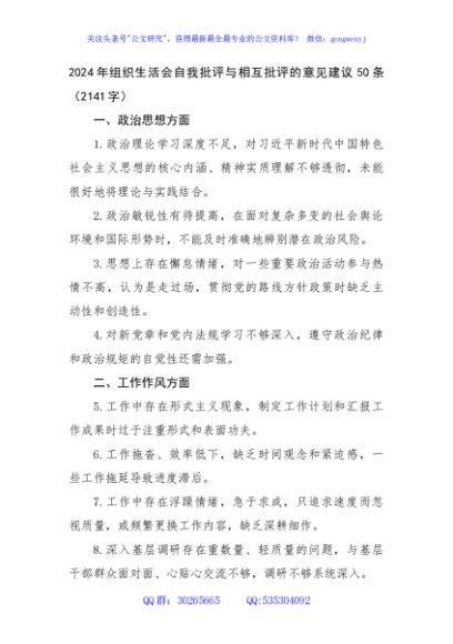 / 2024年组织生活会自我批评与相互批评的意见建议50条(2141字)