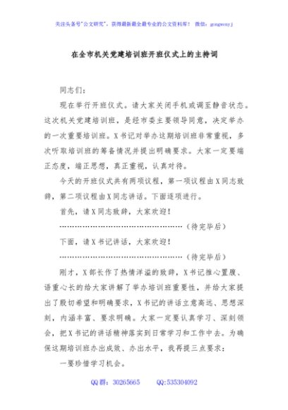 / 在全市机关党建培训班开班仪式上的主持词
