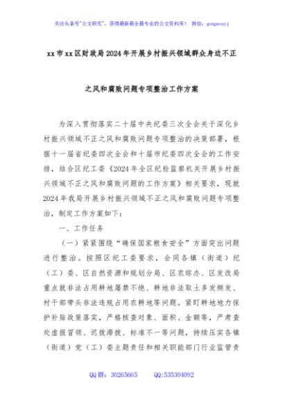 / xx市xx区财政局2024年开展乡村振兴领域群众身边不正之风和腐败问题专项整治工作方案