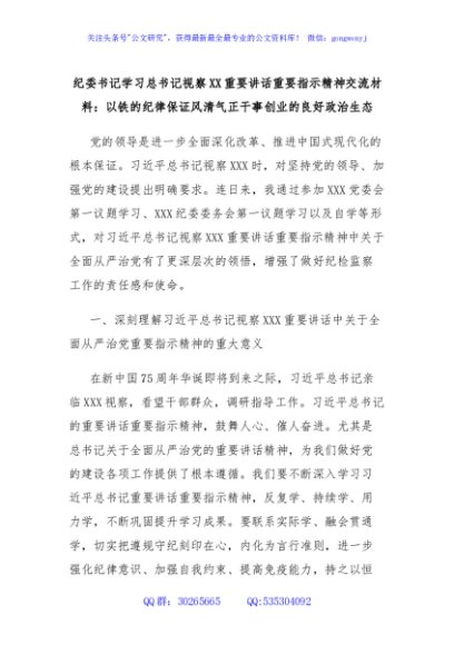 / 纪委书记学习总书记视察XX重要讲话重要指示精神交流材料:以铁的纪律保证风清气正干事创业的良好政治生态