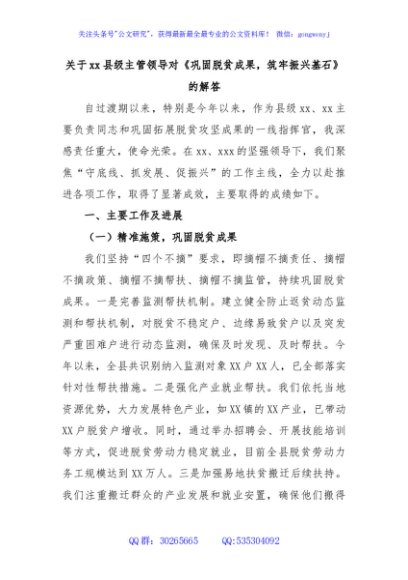 / 关于xx县级主管领导对《巩固脱贫成果,筑牢振兴基石》的解答