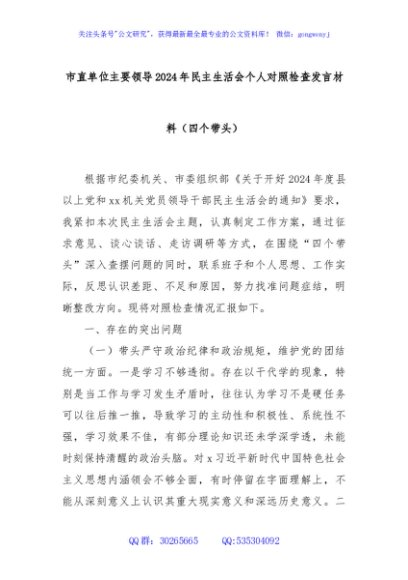 / 市直单位主要领导2024年民主生活会个人对照检查发言材料(四个带头)