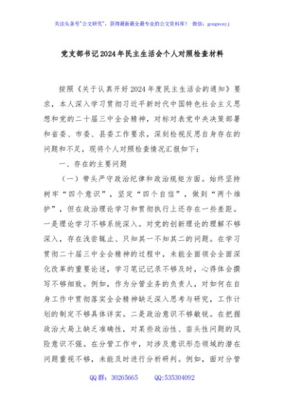 / 党支部书记2024年民主生活会个人对照检查材料