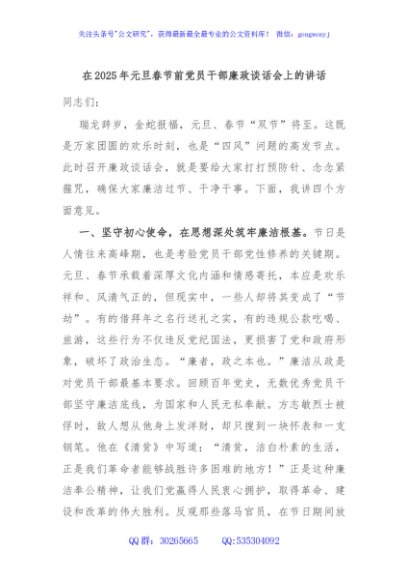 / 在2025年元旦春节前党员干部廉政谈话会上的讲话