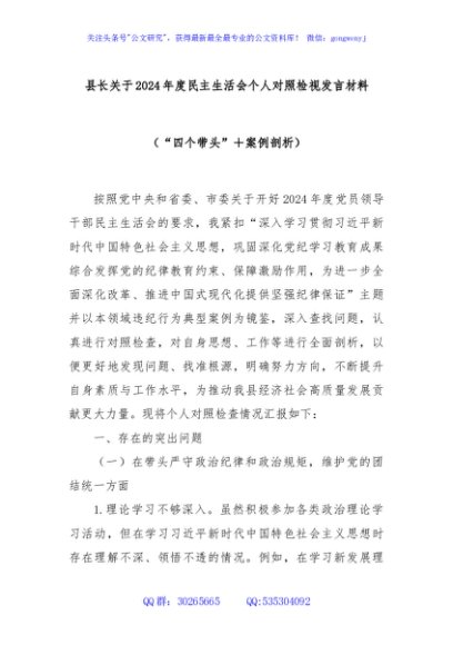 / 县长关于2024年度民主生活会个人对照检视发言材料(“四个带头”+案例剖析)