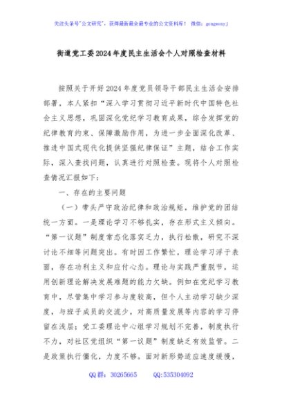 / 街道党工委2024年度民主生活会个人对照检查材料
