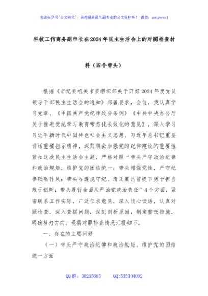 / 科技工信商务副市长在2024年民主生活会上的对照检查材料(四个带头)