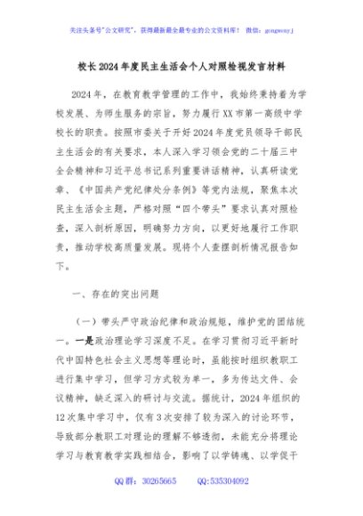 / 校长2024年度民主生活会个人对照检视发言材料