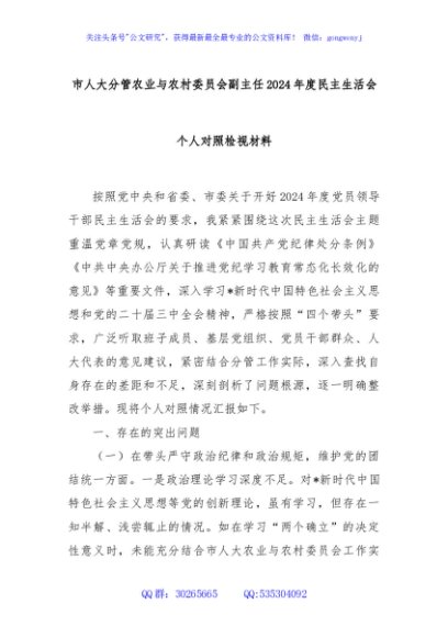 / 市人大分管农业与农村委员会副主任2024年度民主生活会个人对照检视材料