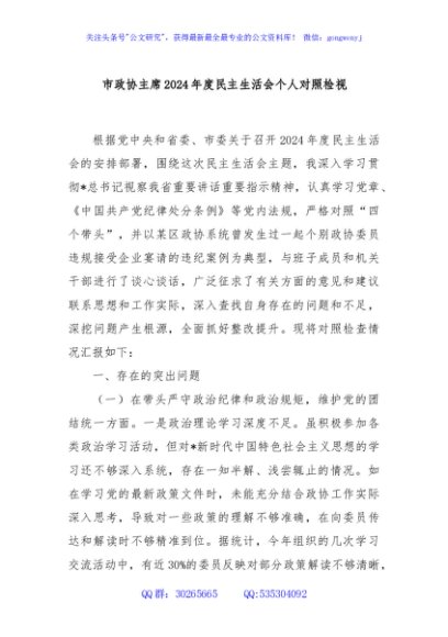 市政协2024年度民主生活会领导班子对照检视发言材料