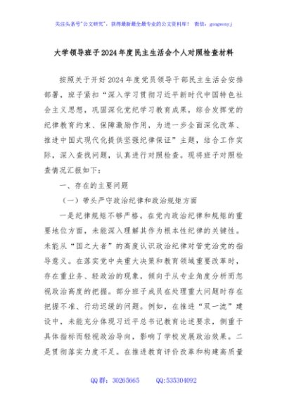 / 大学领导班子2024年度民主生活会个人对照检查材料