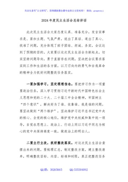 2024年度民主生活会班子对照检查材料和个人发言提纲(参考样式)