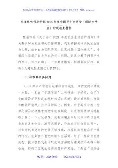 / 市直单位领导干部2024年度专题民主生活会(组织生活会)对照检查材料