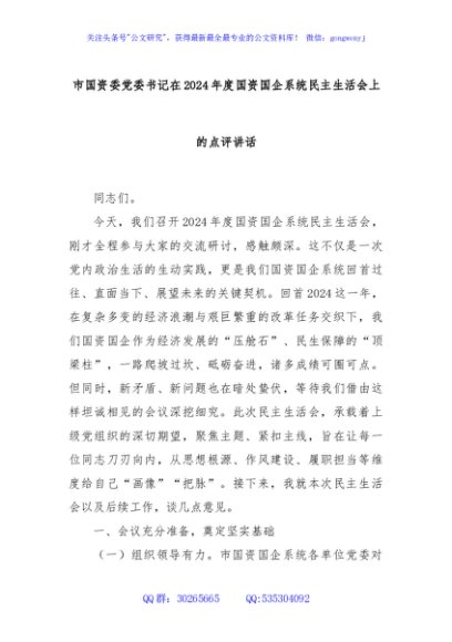 / 市国资委党委书记在2024年度国资国企系统民主生活会上的点评讲话
