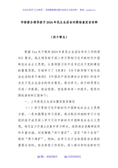 / 市保密办领导班子2024年民主生活会对照检查发言材料(四个带头)