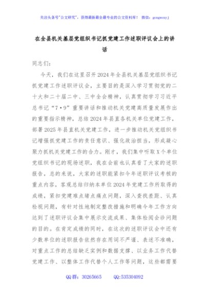 / 在全县机关基层党组织书记抓党建工作述职评议会上的讲话