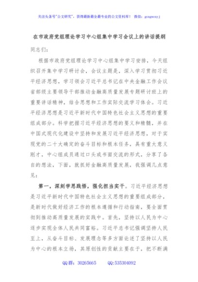 / 在市政府党组理论学习中心组集中学习会议上的讲话提纲
