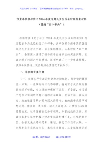 / 市直单位领导班子2024年度专题民主生活会对照检查材料(围绕“四个带头”)