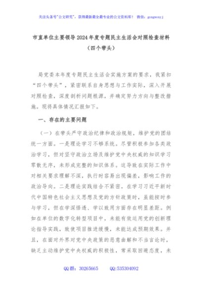 / 市直单位主要领导2024年度专题民主生活会对照检查材料(四个带头)
