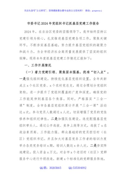 / 市委书记2024年党组织书记抓基层党建工作报告