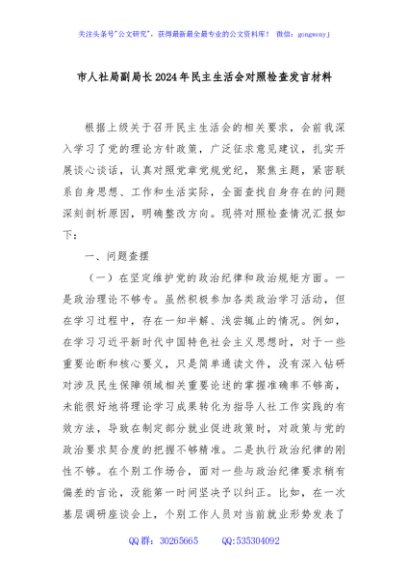 / 市人社局副局长2024年民主生活会对照检查发言材料