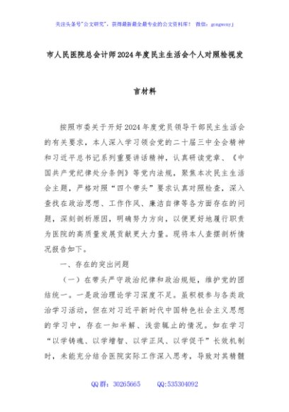 / 市人民医院总会计师2024年度民主生活会个人对照检视发言材料
