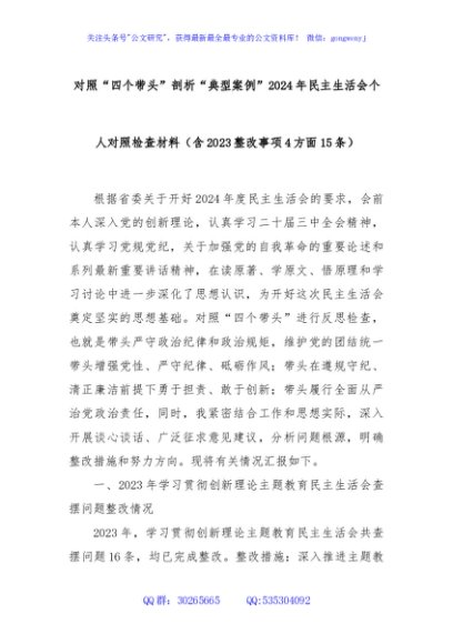 / 对照“四个带头”剖析“典型案例”2024年民主生活会个人对照检查材料(含2023整改事项4方面15条)