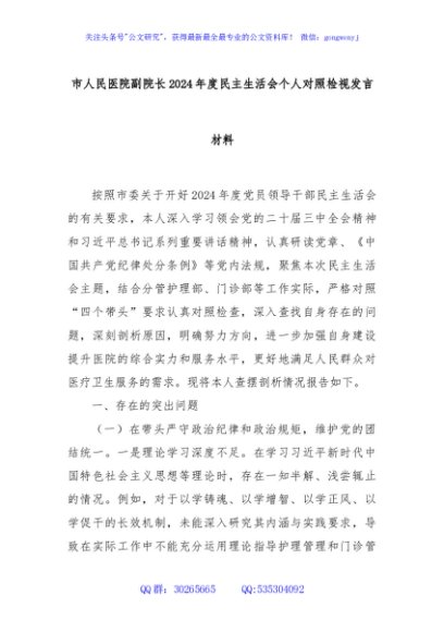 / 市人民医院副院长2024年度民主生活会个人对照检视发言材料