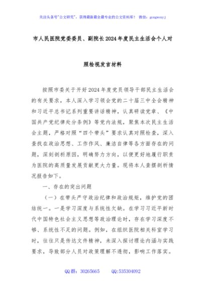 / 市人民医院党委委员、副院长2024年度民主生活会个人对照检视发言材料