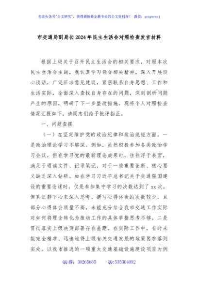 / 市交通局副局长2024年民主生活会对照检查发言材料