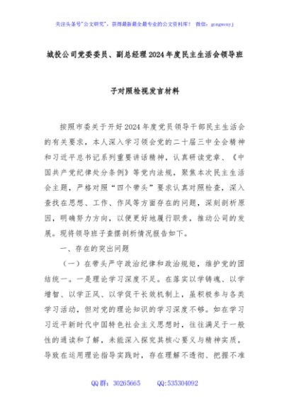 / 城投公司党委委员、副总经理2024年度民主生活会领导班子对照检视发言材料