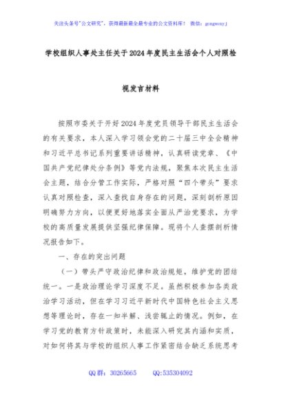 / 学校组织人事处主任关于2024年度民主生活会个人对照检视发言材料