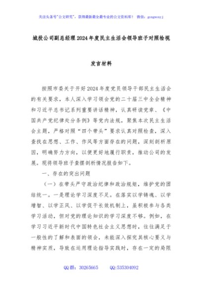 / 城投公司副总经理2024年度民主生活会领导班子对照检视发言材料