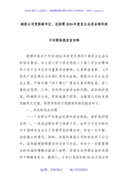 / 城投公司党委副书记、总经理2024年度民主生活会领导班子对照检视发言材料