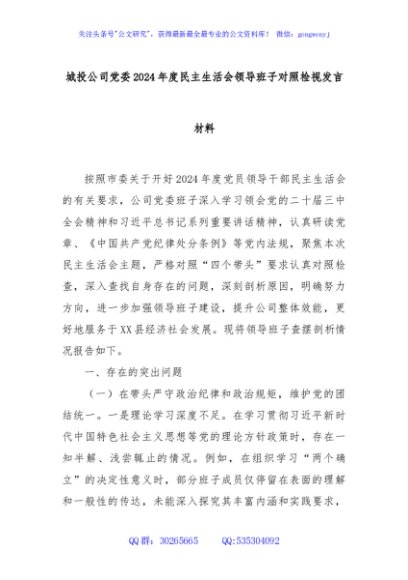 / 城投公司党委2024年度民主生活会领导班子对照检视发言材料