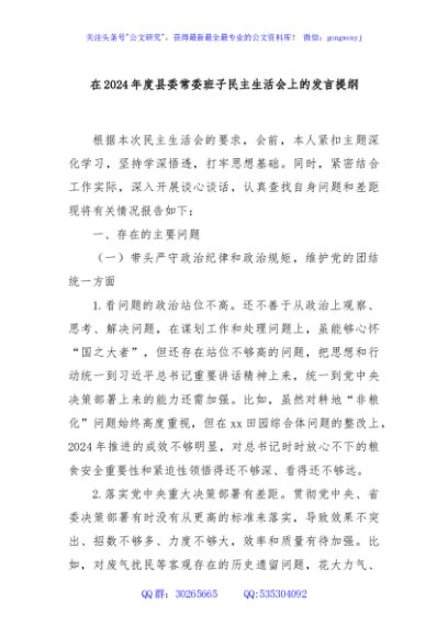 / 在2024年度县委常委班子民主生活会上的发言提纲