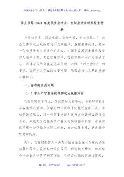 / 国企领导 2024 年度民主生活会、组织生活会对照检查材料