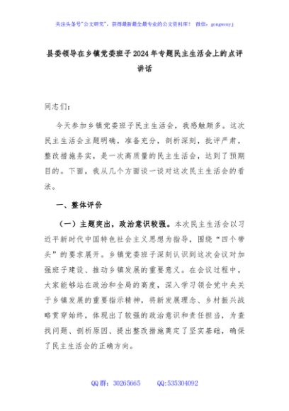 / 县委领导在乡镇党委班子2024年专题民主生活会上的点评讲话