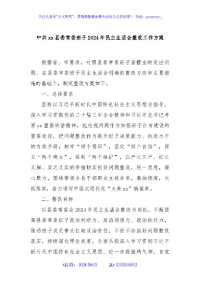 / 中共xx县委常委班子2024年民主生活会整改工作方案
